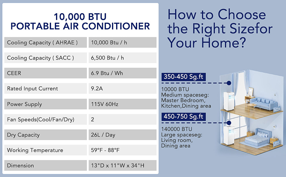 【Potente refrigeración de 10,000 BTU】El aire acondicionado cuenta con una potente capacidad de refrigeración de 10,000 BTU que proporciona una temperatura de hasta 59 °F en un área de 350 a 400 pies cuadrados. Con un diseño compacto, versátil y fácil de usar, este aire acondicionado portátil de pie es ideal para dormitorios, apartamentos, cabañas, autocaravanas, oficinas, dormitorios o salas de estar.