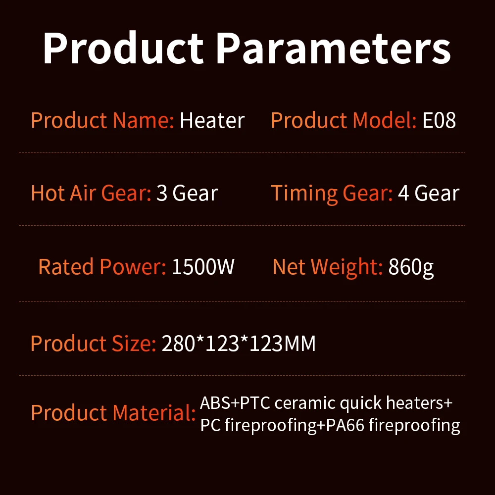 Características del producto: Aire caliente de 3 velocidades | Temporizador de 4 velocidades | Control táctil | Calor cerámico PTC | Apagado automático | Asa de transporte portátil | Doble entrada antimigas | Cubierta de malla antiescaldaduras | 7 niveles de protección