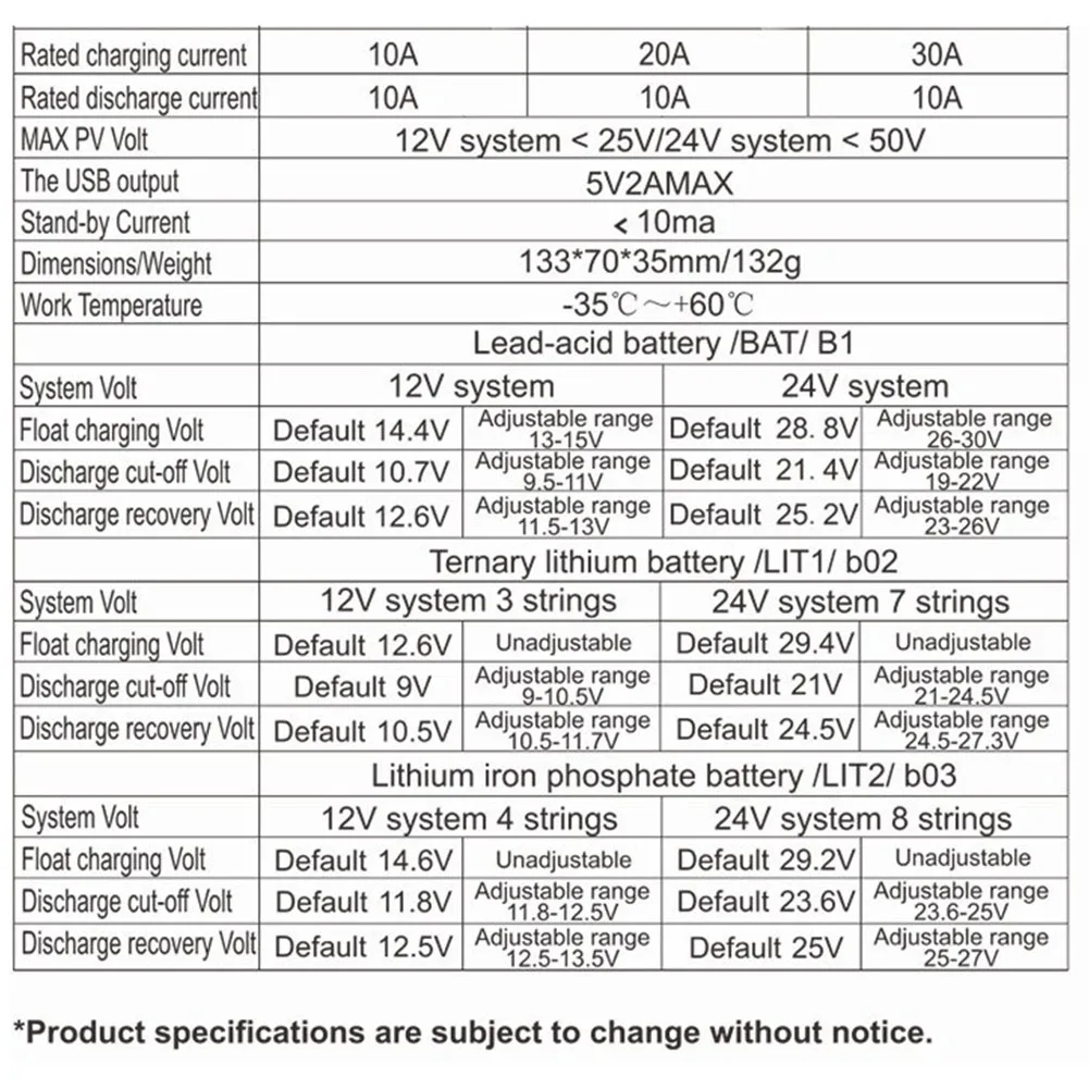 Regulador inteligente de carga solar de 10 A, 20 A y 30 A con puerto USB dual, 12 V y 24 V, PWM ajustable para baterías de fosfato de hierro y litio.