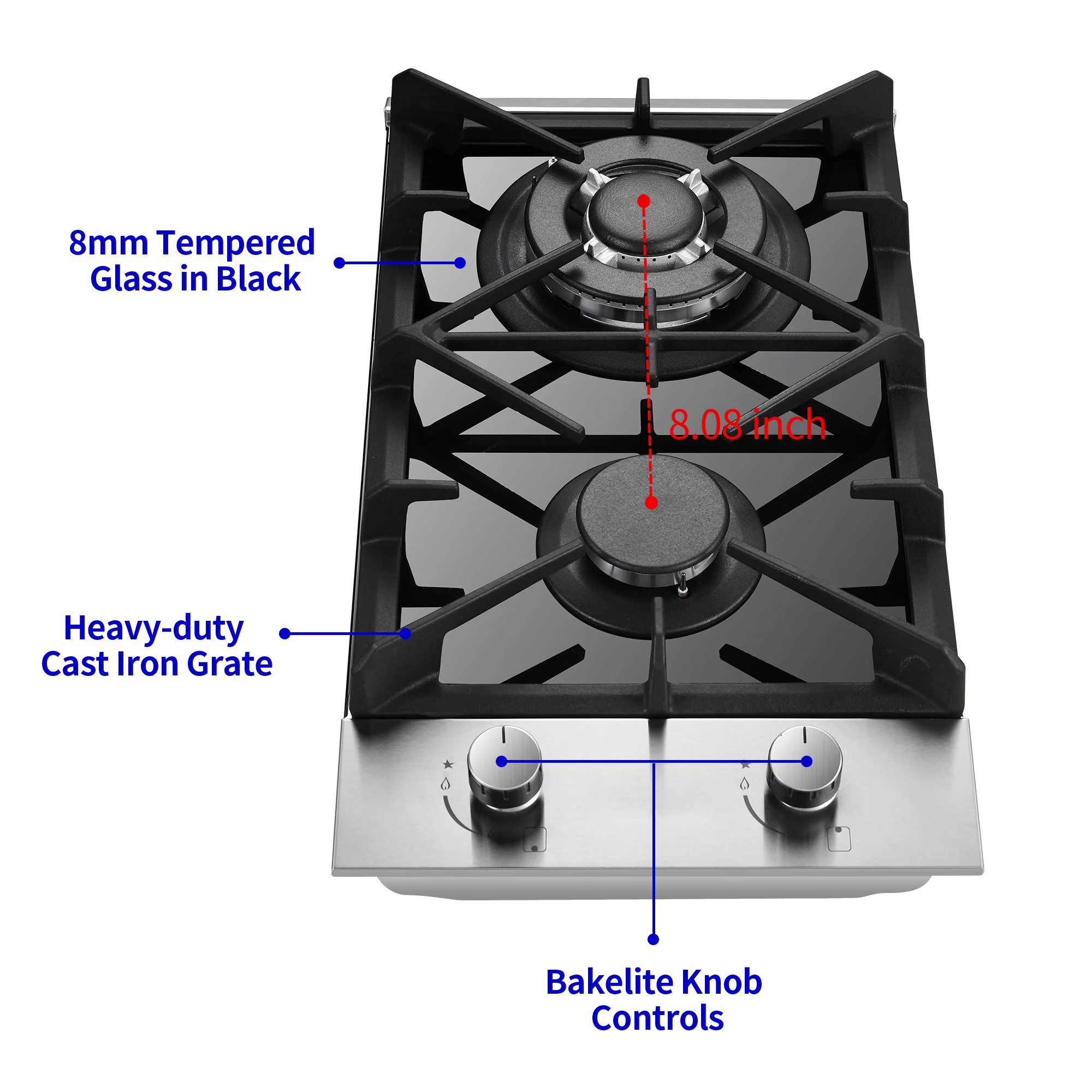 Estufa de gas de 12 pulgadas con dos quemadores, doble combustible (LPG/GN) | Empotrada para exteriores de autocaravanas y apartamentos | Protección termopar, vidrio templado negro