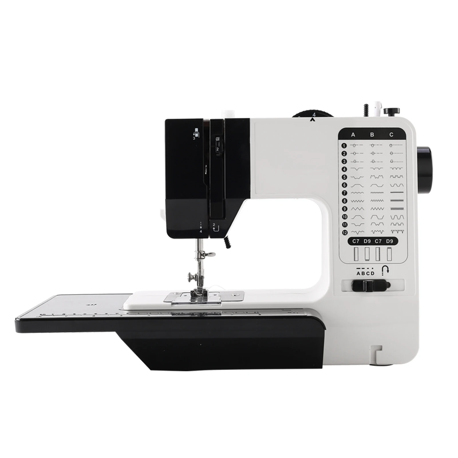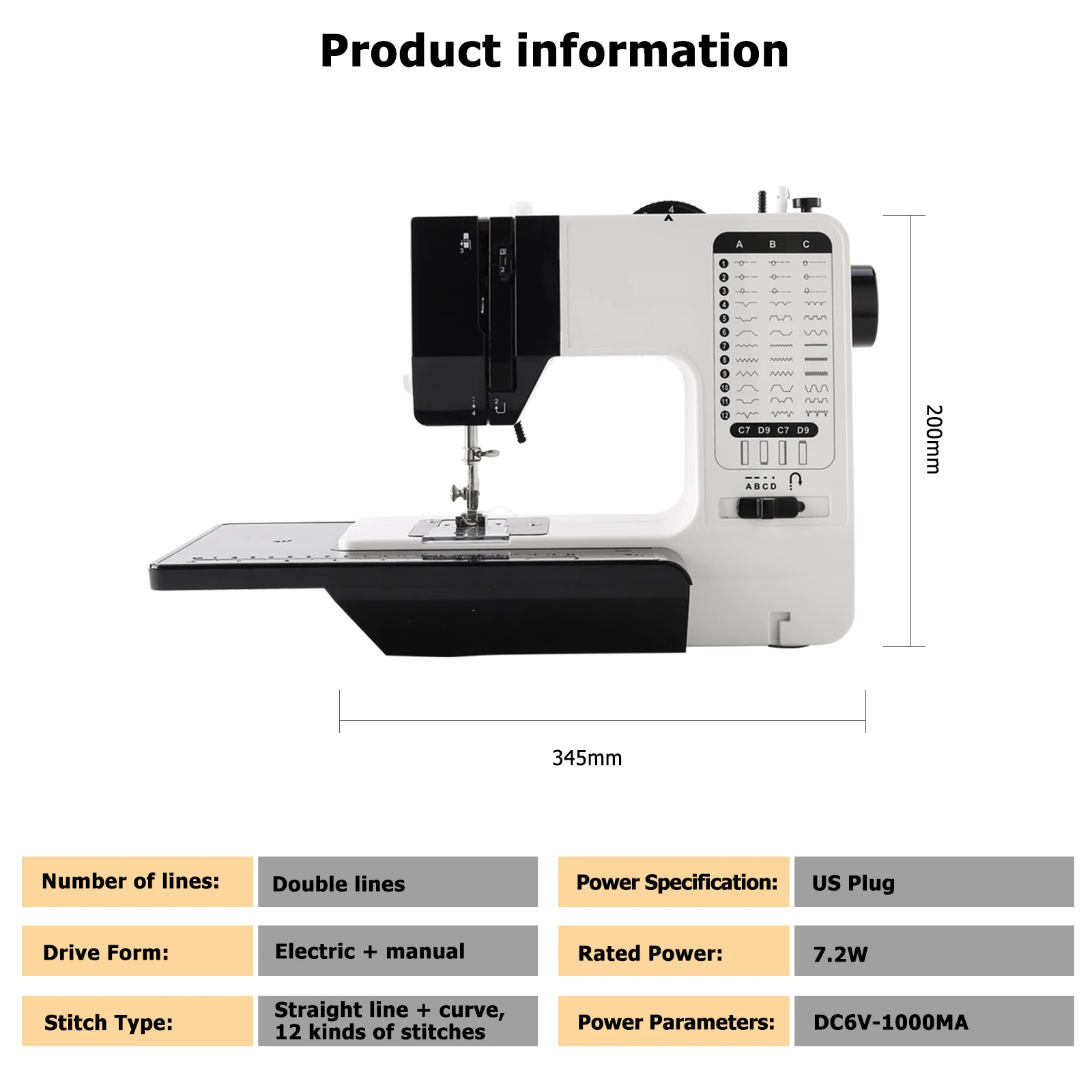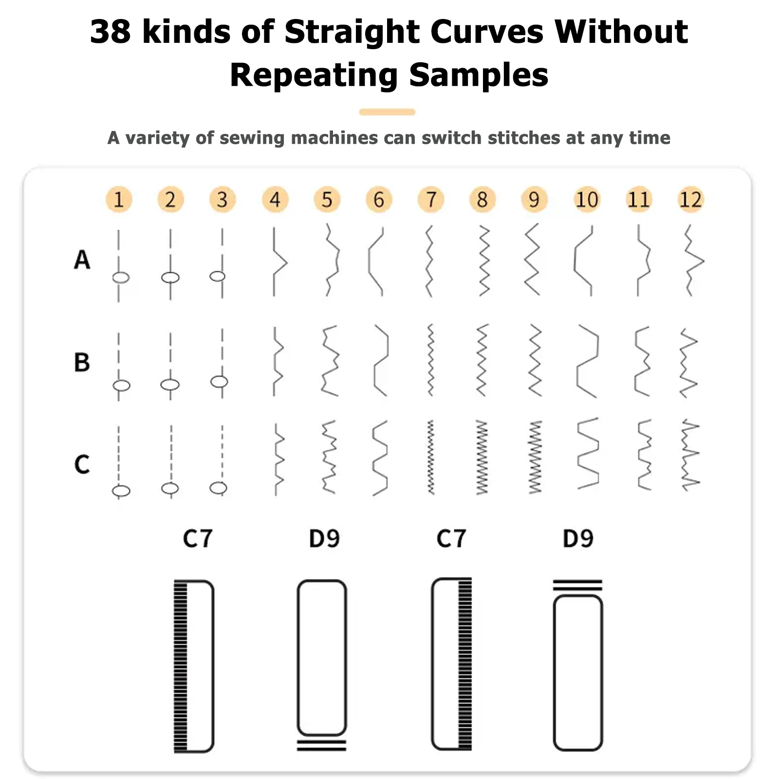 1. El dispositivo tiene 12 tipos de líneas de puntada incorporados, 3 densidades ajustables y hasta 38 (36+2) extensiones de puntada; multifuncional en uno;