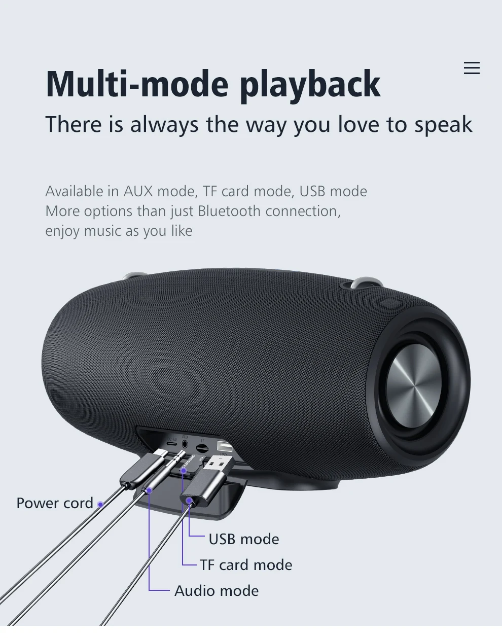 Sin distorsión. Resistente al agua IPX6, carcasa rígida, correa extraíble, conmutable a voluntad entre interiores y exteriores. Reproducción de tarjetas TF, AUX, disco U y otras funciones para viajes.