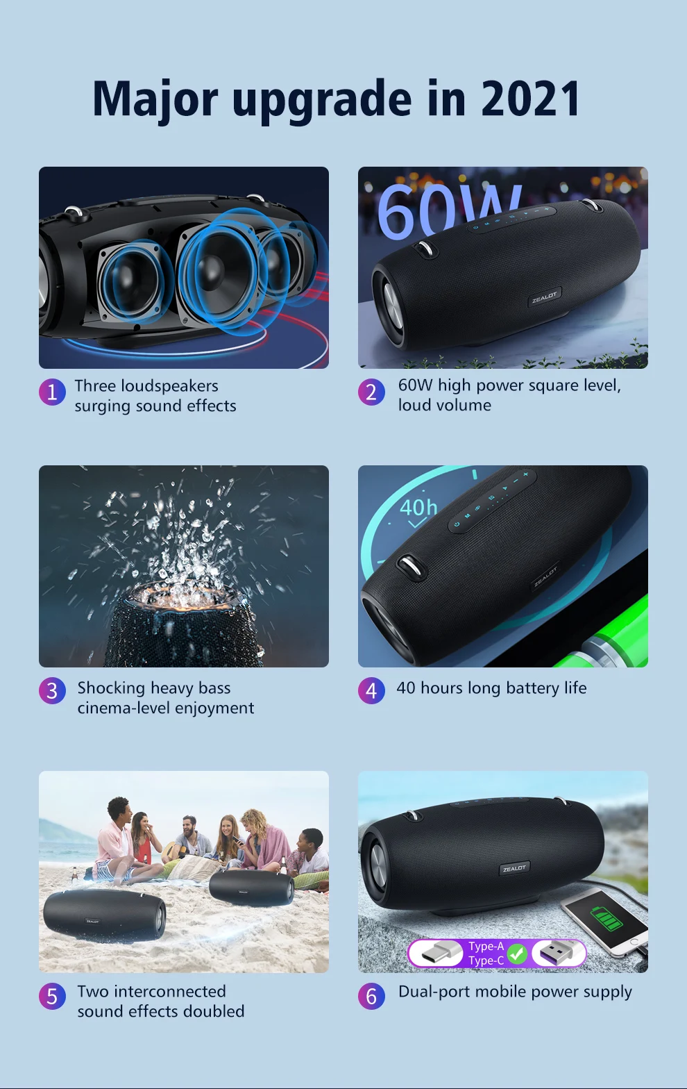 Altavoz Bluetooth ZEALOT-S67, potencia de salida de 60 W, excelente rendimiento de graves, estéreo portátil de alta fidelidad.