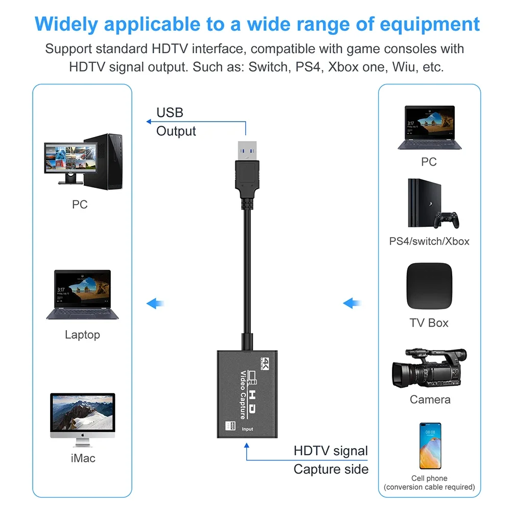 Compatible con interfaces HDTV para conexión directa a consolas PS4/Switch/Xbox, TV Box, cámaras y smartphones (con adaptadores). Permite la captura de vídeo en tiempo real a través de la salida USB a PC/Mac, ideal para configuraciones de streaming híbrido que requieren entrada multifuente.
