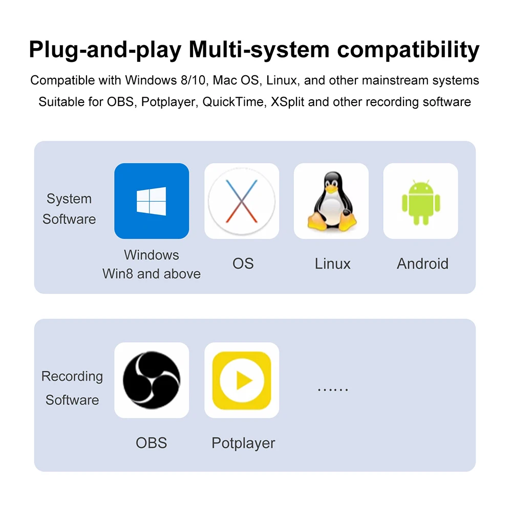 Instalación sin controladores en sistemas Windows/MacOS/Linux/Android. La integración nativa con OBS, PotPlayer y QuickTime simplifica los flujos de trabajo de streaming/grabación tanto para usuarios aficionados como profesionales.
