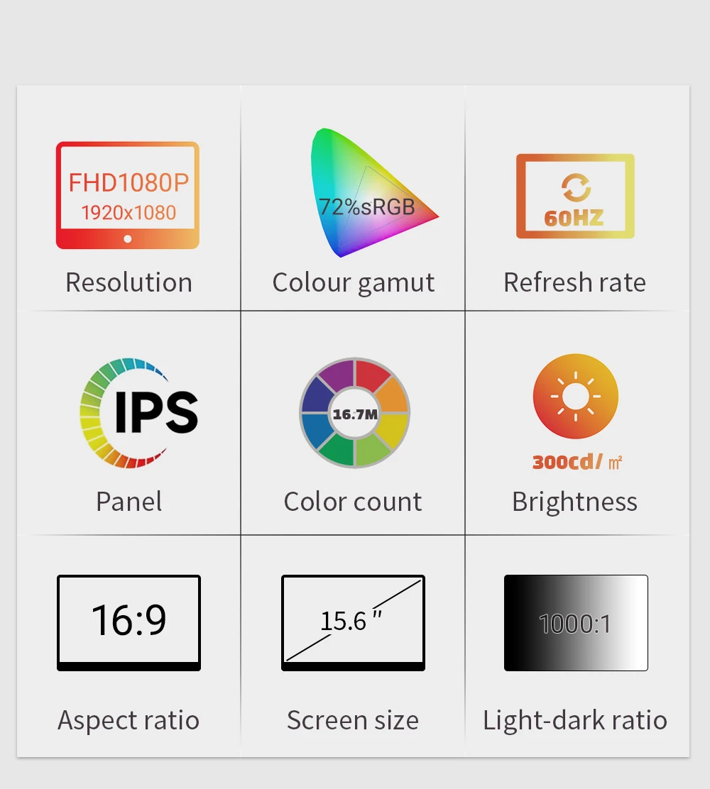 NUEVO monitor IPS de 15,6 pulgadas con alta velocidad de cuadros de 60 Hz, 1080p Ultra HD 1920 * 1080 de alta resolución y HDR; Adopta pantalla IPS 72% sRGB, el ángulo de visión de 178 ° le brinda colores más brillantes, nítidos y naturales, brindando un disfrute visual más vívido.