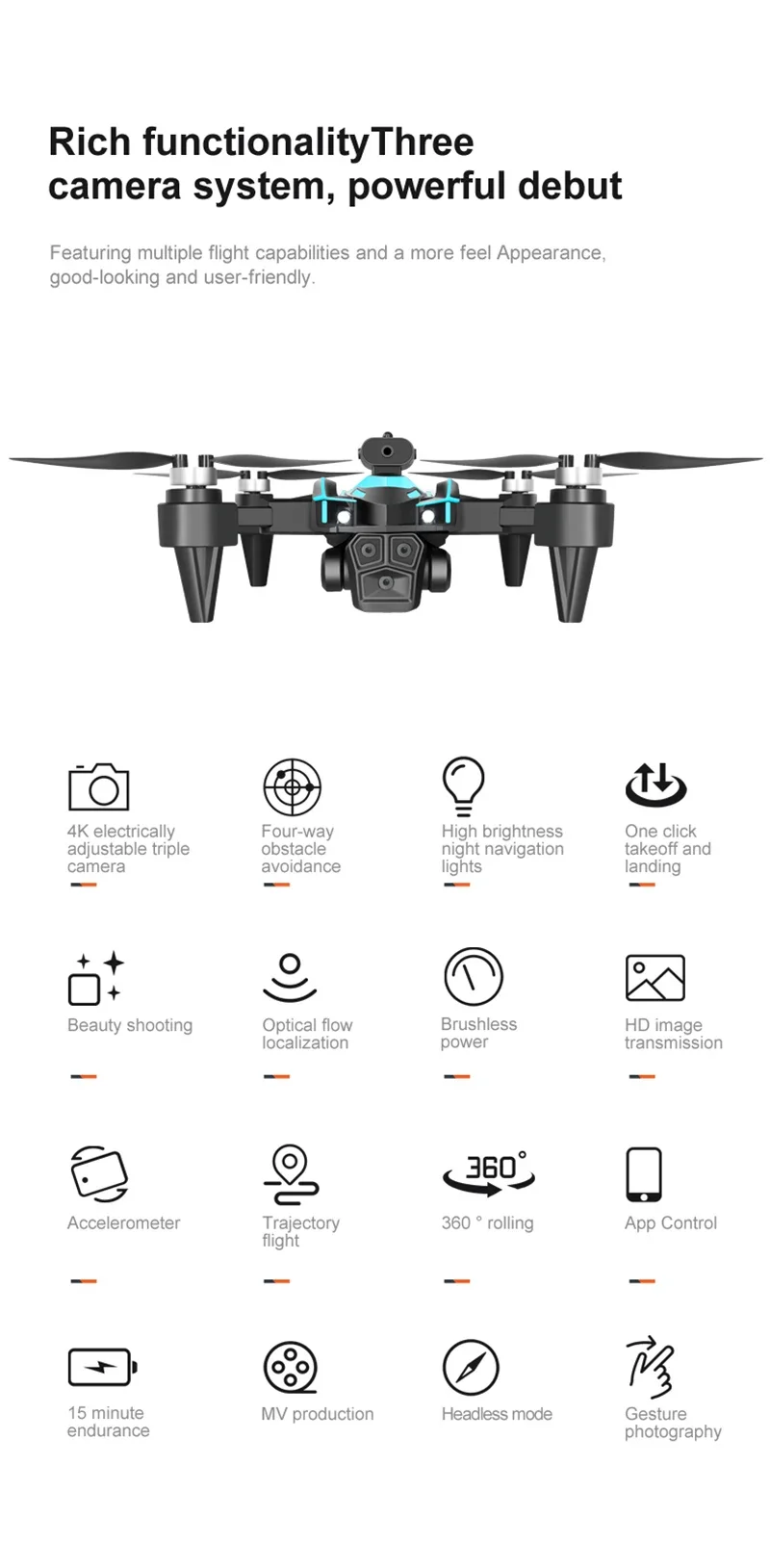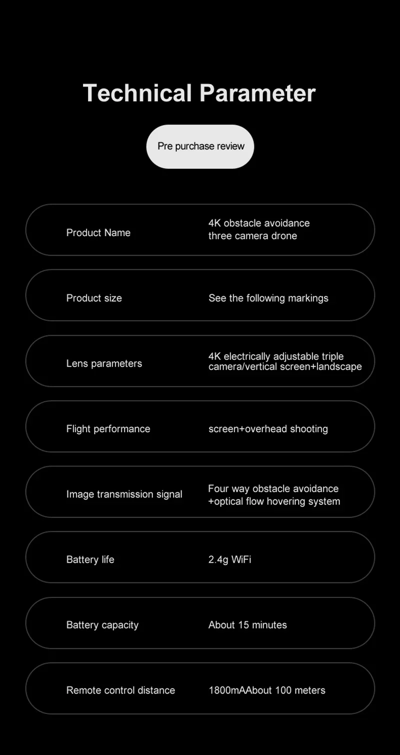 Product configuration parameters: 8K HD Dual camera/optical flow positioning/obstacle avoidance/electric adjustable camera