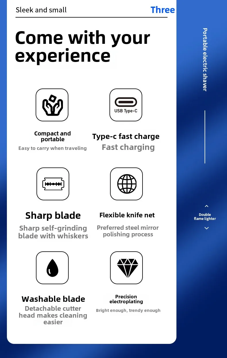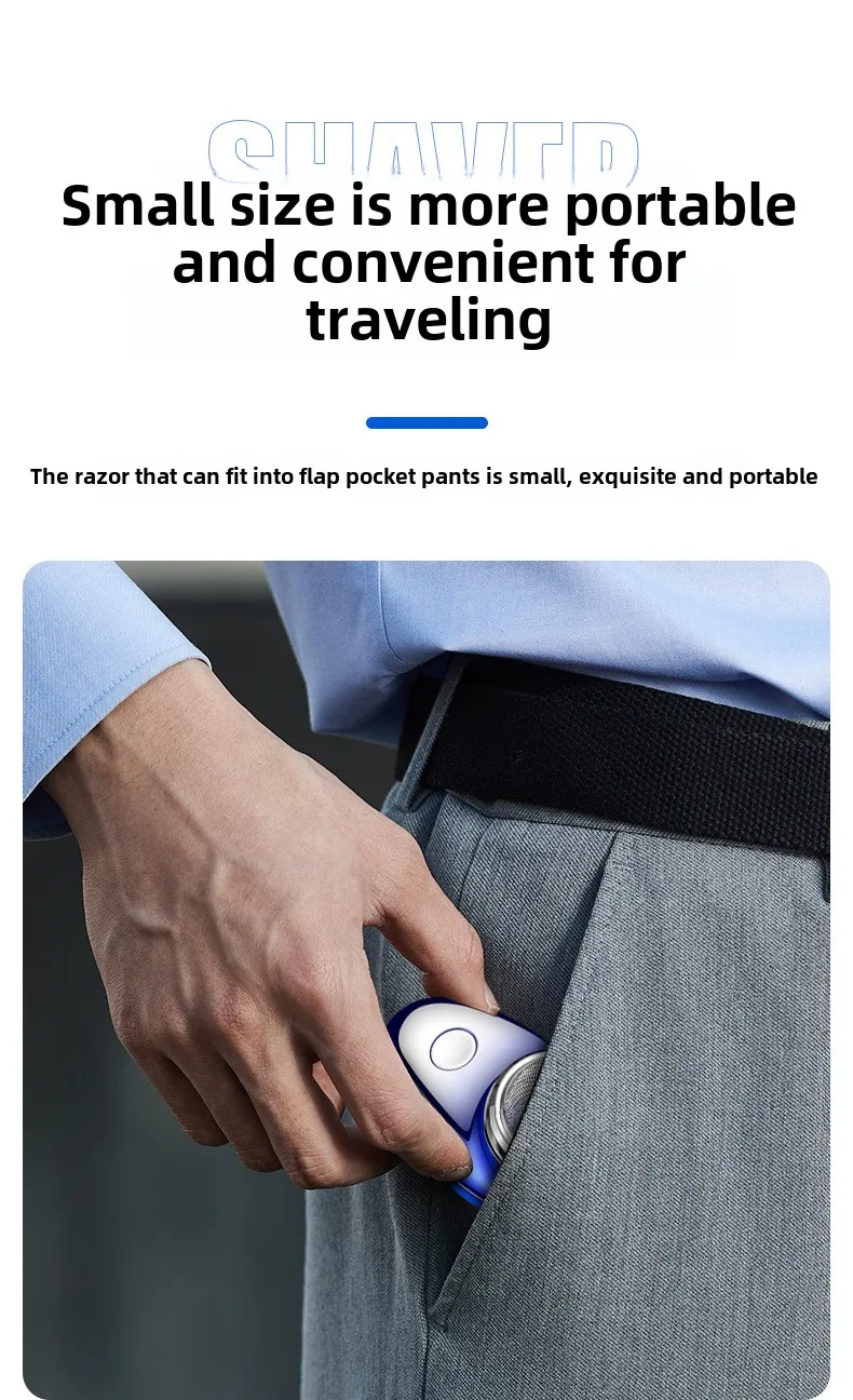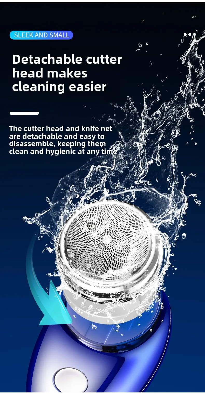 Function: Essential for outdoor travel * * Unparalleled convenience for modern men * * Explore the perfect combination of convenience and performance of men's mini razors. This compact and portable electric shaver is designed to meet the mobile lifestyle of modern men. The stylish design and compact size make it the perfect travel companion, ensuring that you can maintain a neat appearance wherever you travel. This essential beard trimmer has USB fast charging function, which can be used in a few minutes, ensuring that you won't miss any beat in your daily life. **Durable and efficient matching * * This mini shaver is not just about portability; This is also about efficiency. The rotating blade provides a tight and comfortable shaving experience, while the brush motor offers powerful performance. The battery life of the shaver is up to 45-60 minutes, ensuring that you can shave multiple times without frequent charging. Waterproof design makes cleaning easy and maintenance effortless. The noise level is below 36dB, allowing you to enjoy a quiet shaving experience, perfect for early morning or late night. **Specially designed for modern men, this electric shaver comes in a range of fashionable colors to choose from, including Space Silver, Dazzling Blue Black, and Ink Black, which are both fashionable and practical. The ergonomic design ensures a comfortable grip, making it suitable for all face shapes and sizes. Whether you travel frequently or are just looking for a reliable shaving solution, men's mini razors are an important addition to your daily beauty routine. Its long-lasting battery life and USB fast charging