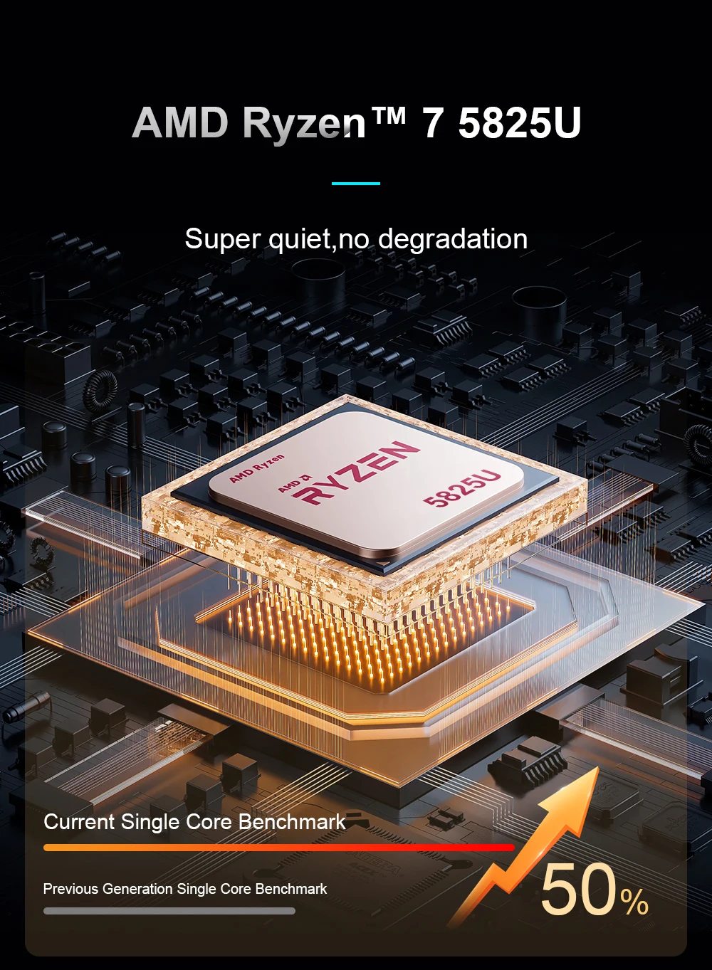 Powerful core leads the future! Adopting innovative design, it is ultra-quiet and does not degrade performance, allowing you to enjoy a smooth and stable operating experience. The single-core benchmark test performance is excellent, with an improvement of up to 50% compared to the previous generation, and it can easily handle various high-load tasks. Devices equipped with this processor can unleash unlimited possibilities, whether for work or entertainment. Choose AMD Ryzen 7 5825U and enjoy the ultra-fast journey brought by technology!