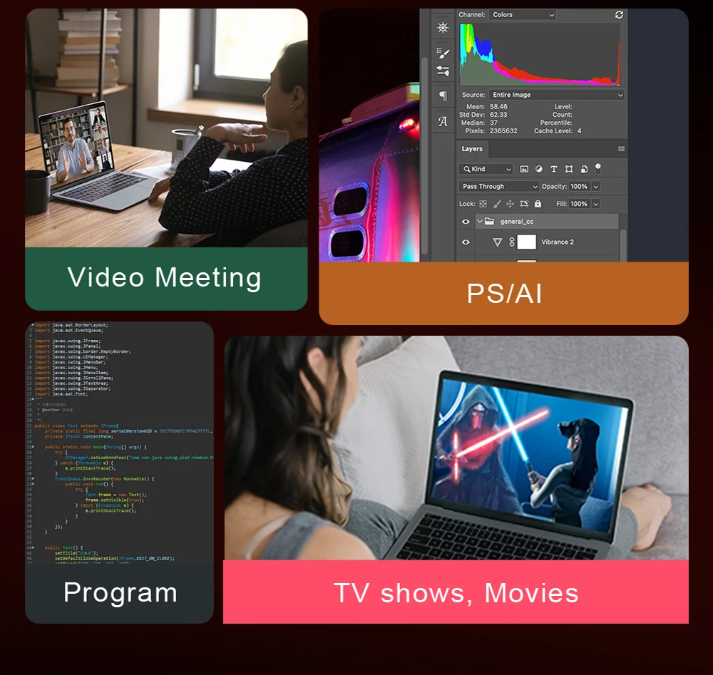A15 Plus offers a delightfully vibrant display that delivers stunning color accuracy and detailed images that also can help reduce eye strain from long work hoursDifferent User Scene