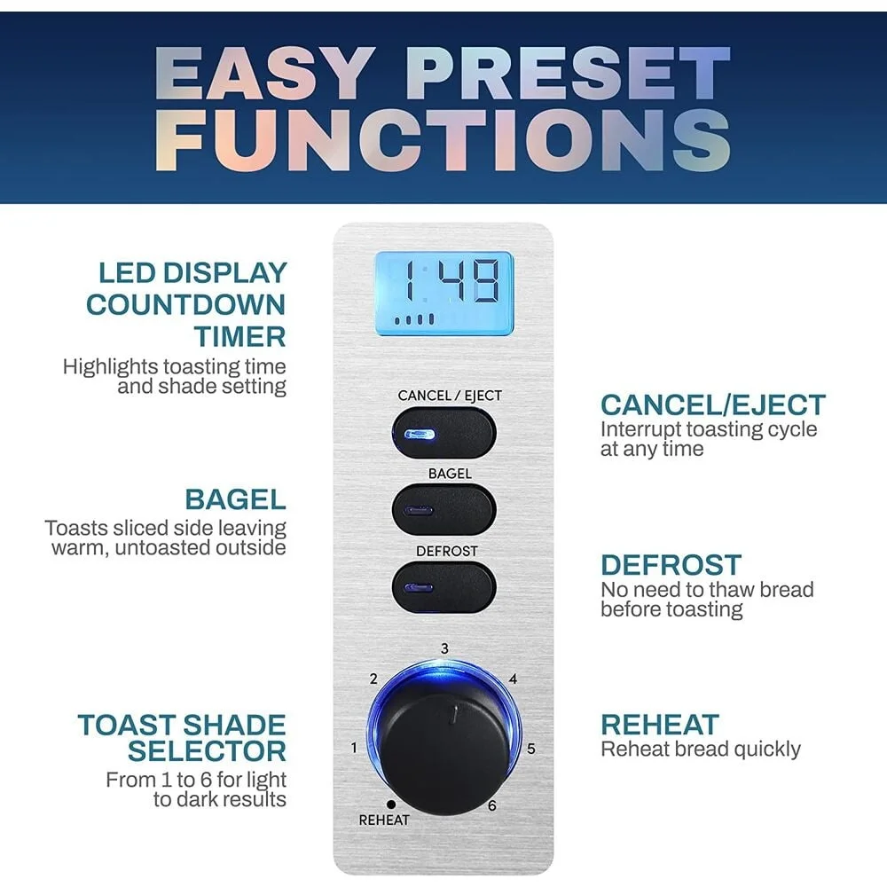 6 ADJUSTABLE TOASTING LEVELS WITH LED DISPLAY: To select the perfect shade for your bread with Countdown Timer.