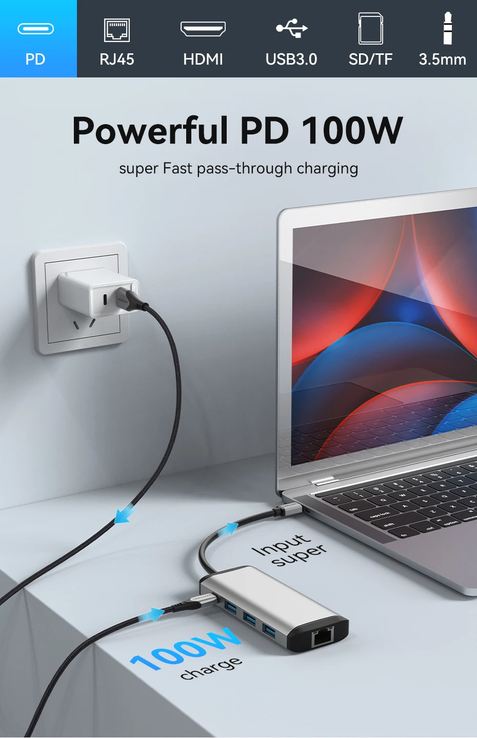 PD 100W Charge/SD/TF/USB3.0*3/3.5mm▶Powerful PD 100W