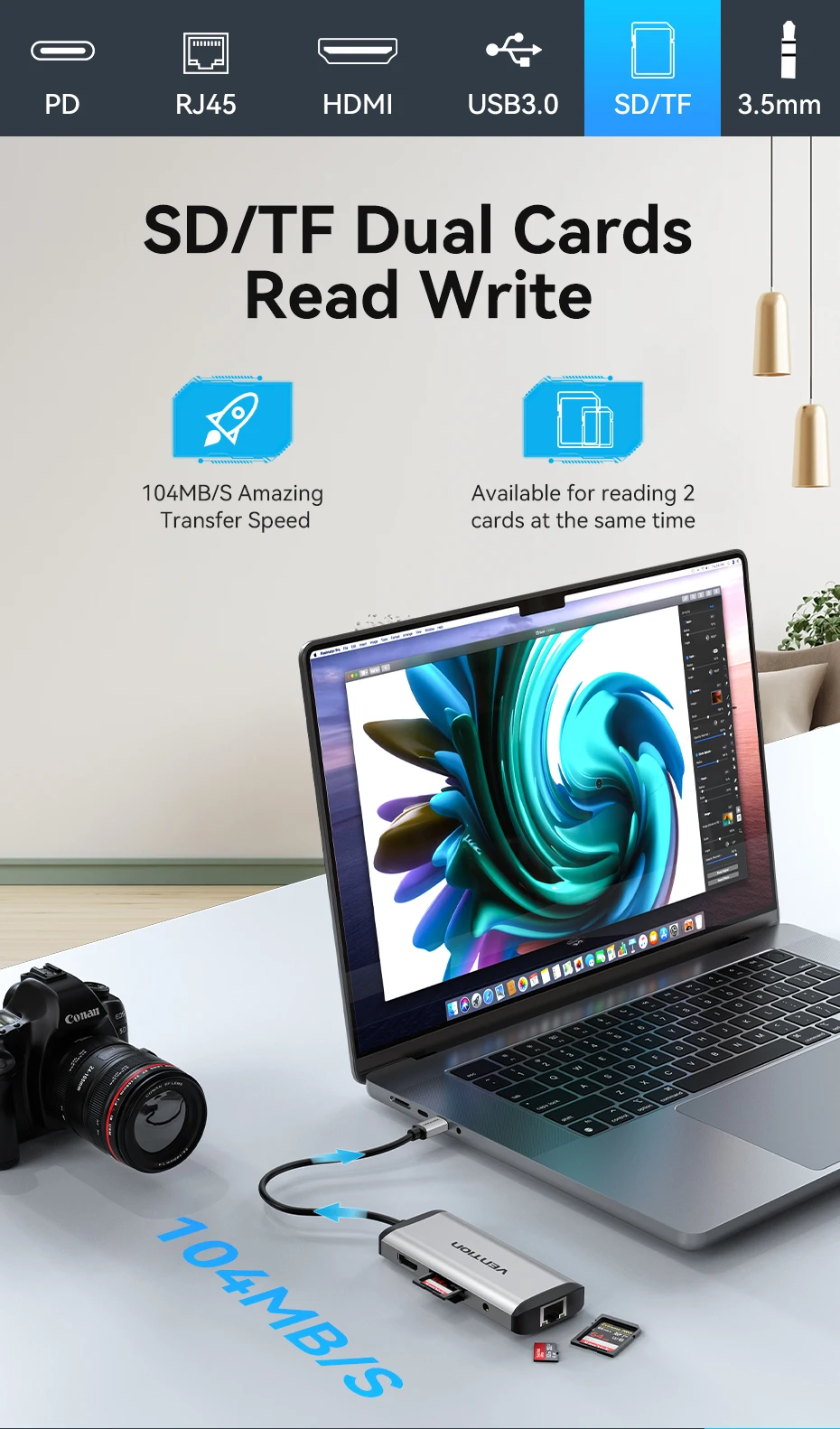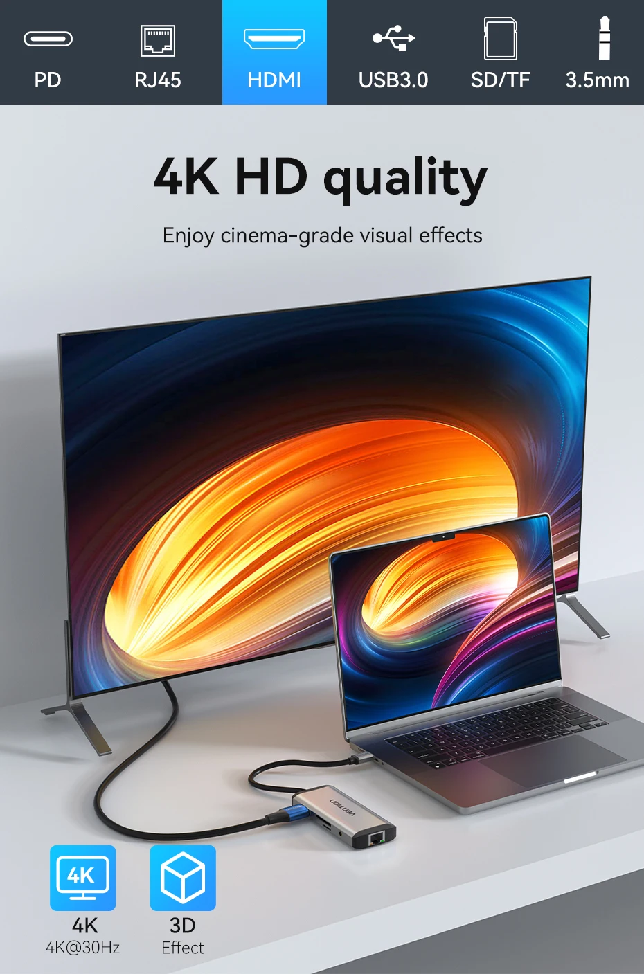 Feature 1: USB-C to 4K HD/Card reader/RJ45/PD adapter
