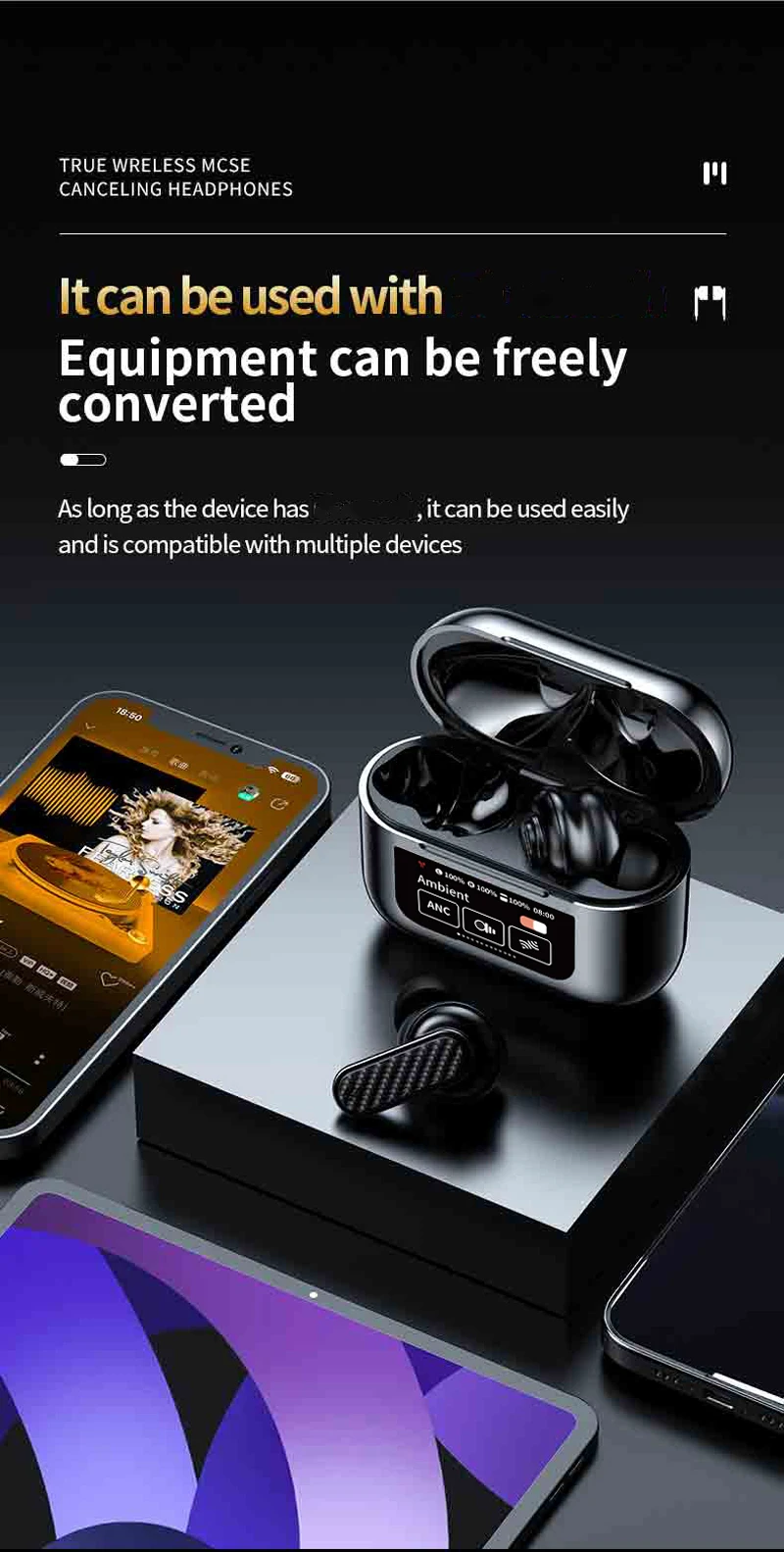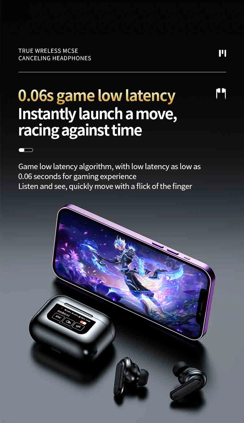 Wireless Headphone Earphones LED Touch Screen Visible Active Noise Cancellation music Headset Sport Earbuds With Microphone