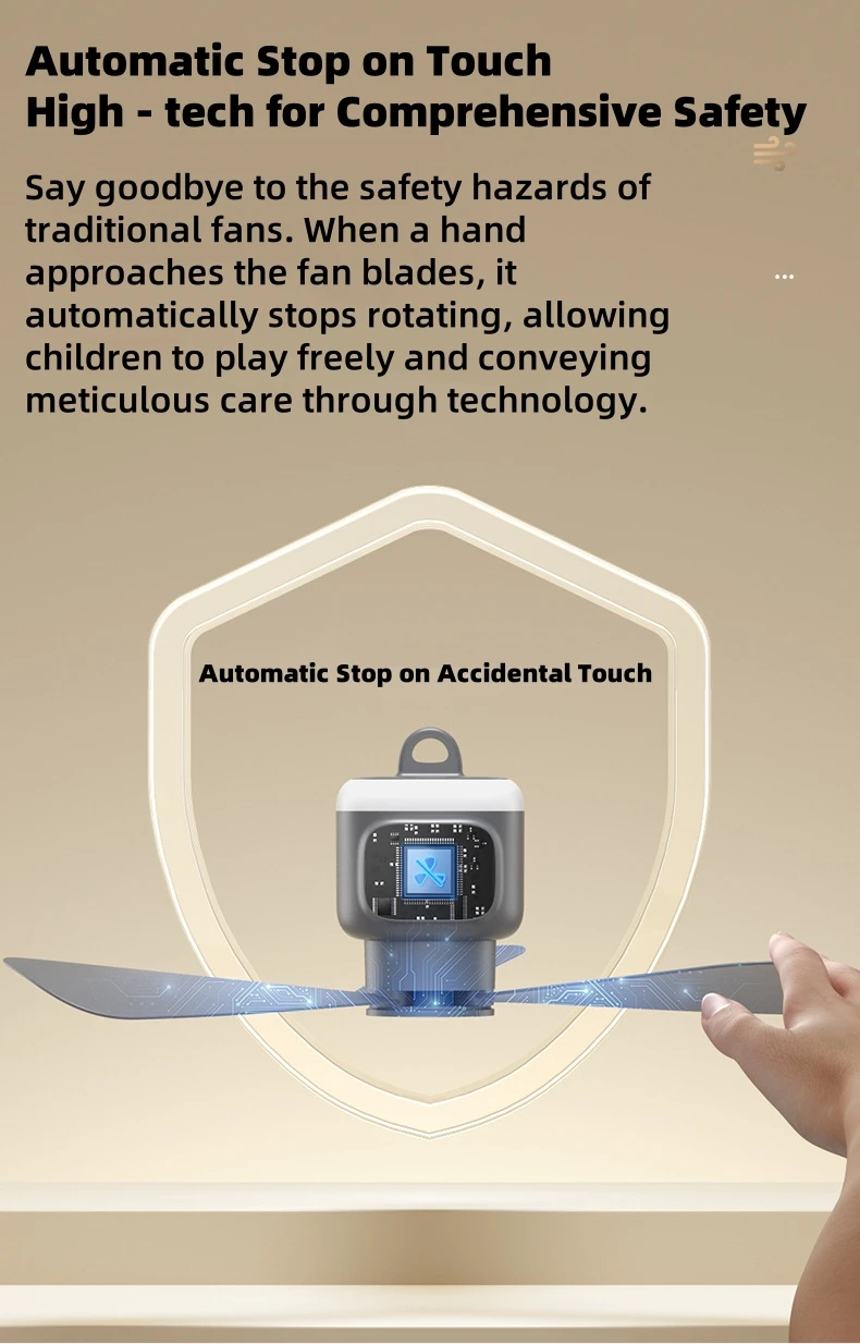 【Safety】In the case of fan function, it will automatically stop rotating after a collision, effectively protecting you from being accidentally injured in the small tent space.