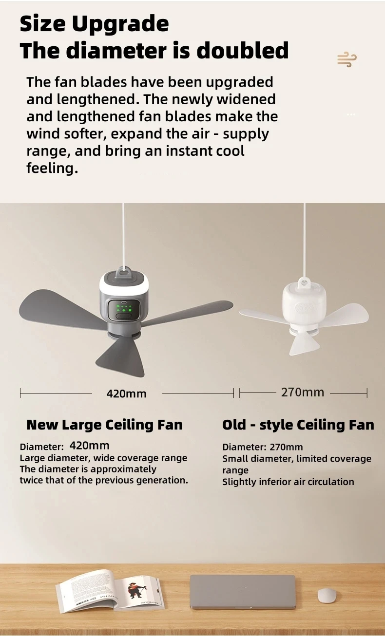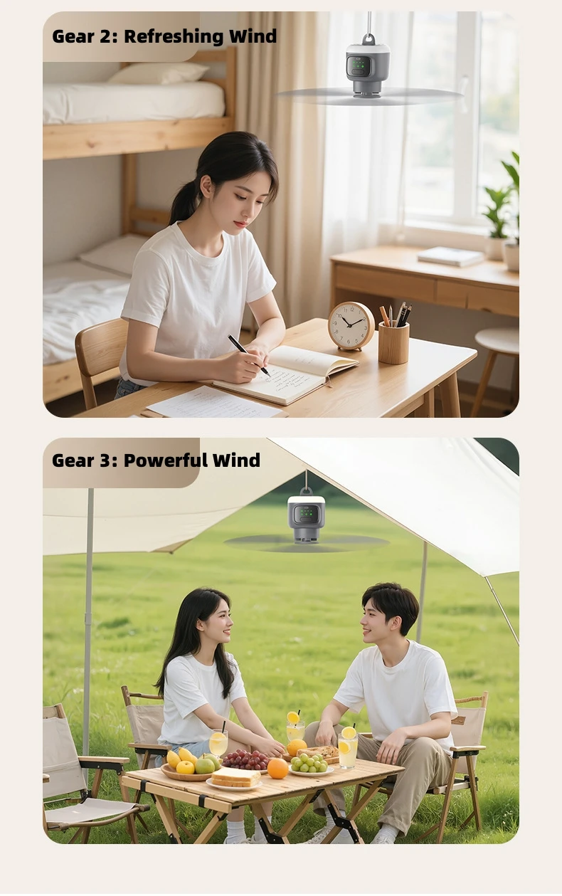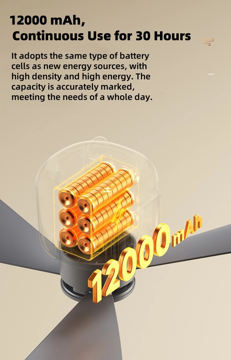 【12000mAh Ultra Long Battery Life】This ceiling fan has a large battery capacity of 12000mAh and a long battery life of 30H. It is the best choice for camping.